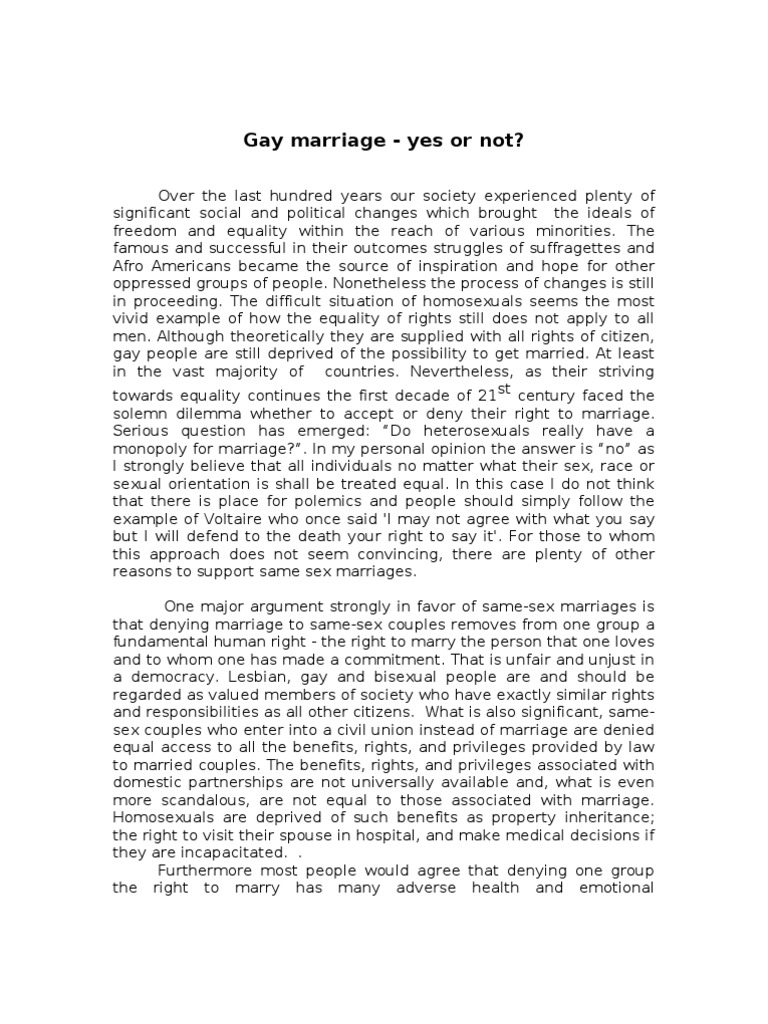 Remember (even when writing a gay rights persuasive essay) to remain impartial and objective. Consider the other side of the debate. Acknowledge the limitations of your research. The last thing you want is to sound biased. Keep in mind that the gay marriage argument essay is an academic paper. It should follow all applicable academic writing · Homosexual union goes against the biological meaning of marriage, the aim of which is procreation. That is why same-sex marriage is in a way a self-contradiction already, as such union is incapable of bearing children. According to Dr Patricia Morgan: “It reinforces the idea that marriage is irrelevant to parenthood.” Words | 3 Pages. In most countries worldwide, gay marriage is illegal, forcing homosexuals to remain hidden out of a sense of shame and fear. Many religions, including Judaism and Islam, forbid homosexual acts and behaviour. This is worrying for society as one may not be accepted by one’s own religion, as well as being rejected by society
